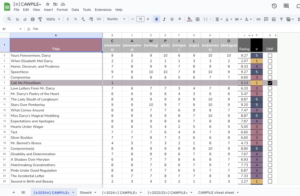 Loosely. On Goodreads? Absolutely. Everywhere else? Hahaha…. ha.. ha. Seriously though, my Kindle auto tracks my reads on Goodreads and I am lazy. I do keep a spreadsheet to calculate my CAWPILED ratings, but I literally only put the book title in there and use my yearly Goodreads challenge to find the author and other information for wherever else I might want such information.