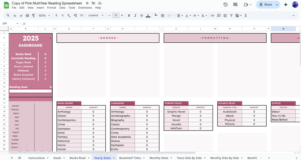 I also have a multiyear reading tracker that I purchased on Etsy that I like a lot, but I have been super lazy with and haven’t started filling it out yet. Oops, I should get on that probably. I didn’t fill it out for 2024 either. It’s supposed to track for five years, which is awesome if you like data, but lame when you don’t actually spend the few moments to set it up and fill it out. I guess I would rather be reading?