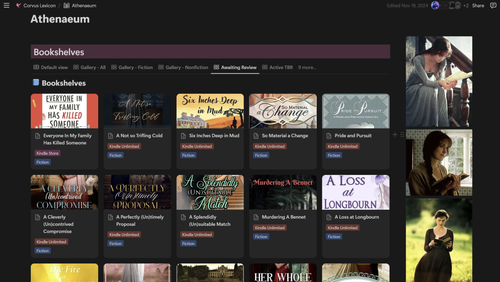 One of the many things I keep in Notion, is my library. It’s a serious work in progress, but I am slowly adding in all the books I have read and the ones I own. My printed library is way easier, my digital library on the other hand is insane. I have hundreds upon hundreds of free kindle books, nevermind my purchases, old arcs (which why bother getting rid of when I can still read them again and a again?), and freebie downloads from author/publisher newsletters and whatnot. I’ve been using it because it just makes tracking things so much nicer on me. I can track exactly what I want, how I want, where I want. It makes it so much easier going through things. My ADHD leaves me as one of those people who absolutely loves spreadsheets, so setting this up and maintaining it fills that void while being more useful to me.